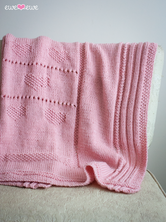 Wrap your little sweetheart in love with this adorable blanket that features seed stitch hearts, sweet eyelets and a simple cable twist border.