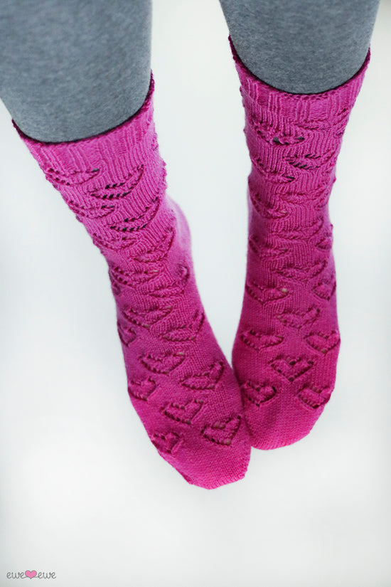 Dive into the charm of our Ewe Heart Socks! Adorned with sweet lacy hearts, these socks are a joy to knit. Perfect for Valentine's Day or any day you want a touch of love.